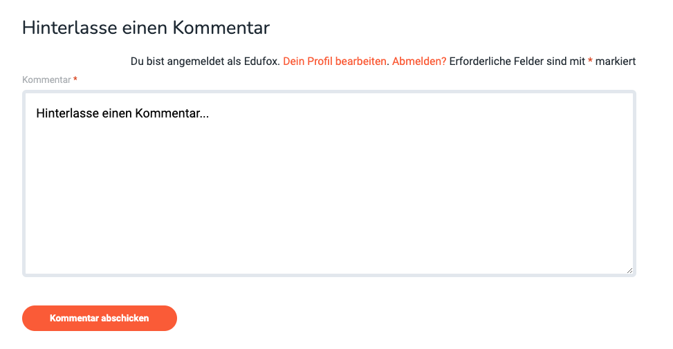 Am Ende jeder Lektions- und Themenseite kannst du einen Kommentar verfassen. Diese Funktion ist da, um das Edufox-Team auf gewisse Sachen aufmerksam zu machen. Zum Beispiel könnte es sein, dass es auf einer Seite ein technisches Problem gibt, oder du hast einen Fehler gefunden, oder du hast einfach nur einen Verbesserungsvorschlag.