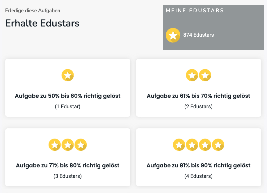 Du kannst sehen, wie viele Edustars zu besitzt und wie viele Edustars du bekommst für das Lösen der interaktiven Aufgaben.